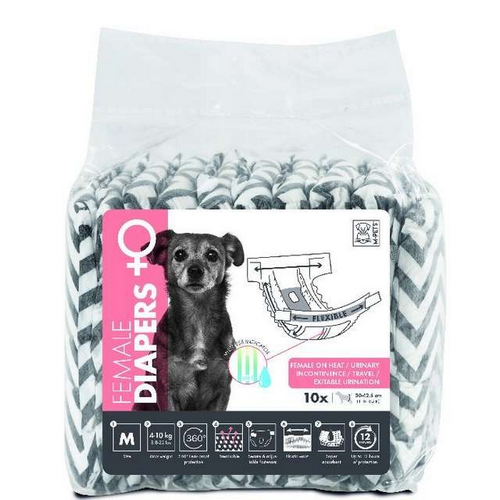 חיתולים חד פעמיים 10 יחידות במידה M מיועד לכלבות מגזעים בינוניים (משקל 4-9 ק"ג, היקף מותניים 28-48 ס"מ) | מעניק הגנה מלאה מפני נזילות | אידיאלי לשימוש בזמן ייחום, בנסיעות ארוכות או במקרים של קושי בשליטה על צרכים.