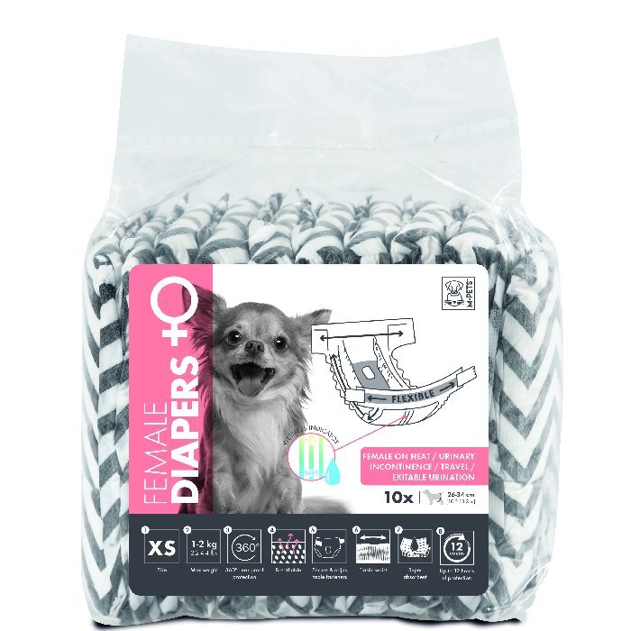 חיתולים חד פעמיים 10 יחידות במידה XS מיועד לכלבות קטנות במיוחד (משקל 1-2.5 ק"ג, היקף מותניים 20-40 ס"מ) | מונע נזילות באופן יעיל | מושלם לשימוש בזמן ייחום, בנסיעות ארוכות או עבור כלבות עם קושי בשליטה על הסוגרים.