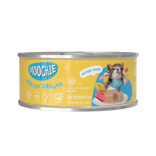 שימורים מוצ'י מזון מלא ומאוזן לגורי חתול להתפתחות תקינה – מוס טונה ועוף 156 גרם. רכיבים: טונה, עוף, סרדין, כבד בקר, חומצת אמינו, שמן חמניות, ויטמינים, מינרלים, טאורין, חומרי ג'ל (כולל קרגינן), חזה עוף, חומרי צבע, שמן סלמון.