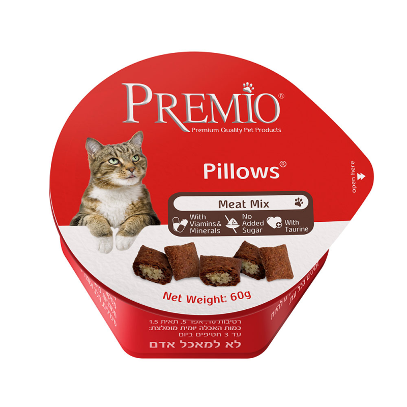 מזון משלים לחתולים חטיף רך בצורת כריות עם בקר, ברווז והודו. רכיבים: דגנים, בשר ומוצריו (4% ברווז, 4% בקר, 4% הודו), שמנים ושומנים, דגים ומוצרי דגים, תמצית חלבון צמחי, מוצרים מן הצומח, שמרים, מינרלים, חלב ומוצריו, טאורין.