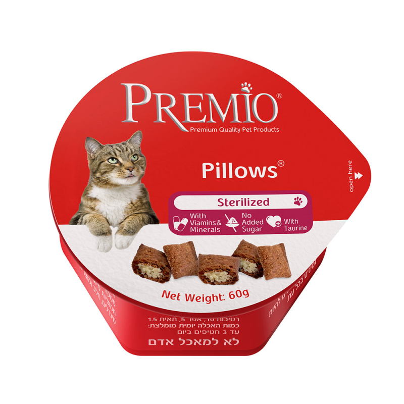 מזון משלים לחתולים חטיף רך בצורת כריות לחתולים מעוקרים/מסורסים עם עוף וחמוציות. רכיבים: דגנים, בשר ומוצריו (16% עוף), שמנים ושומנים, תמצית חלבון צמחי, מוצרים ממקור צמחי, פירות (2% חמוציות מיובשות), שמרים, מינרלים, חלב ומוצריו.