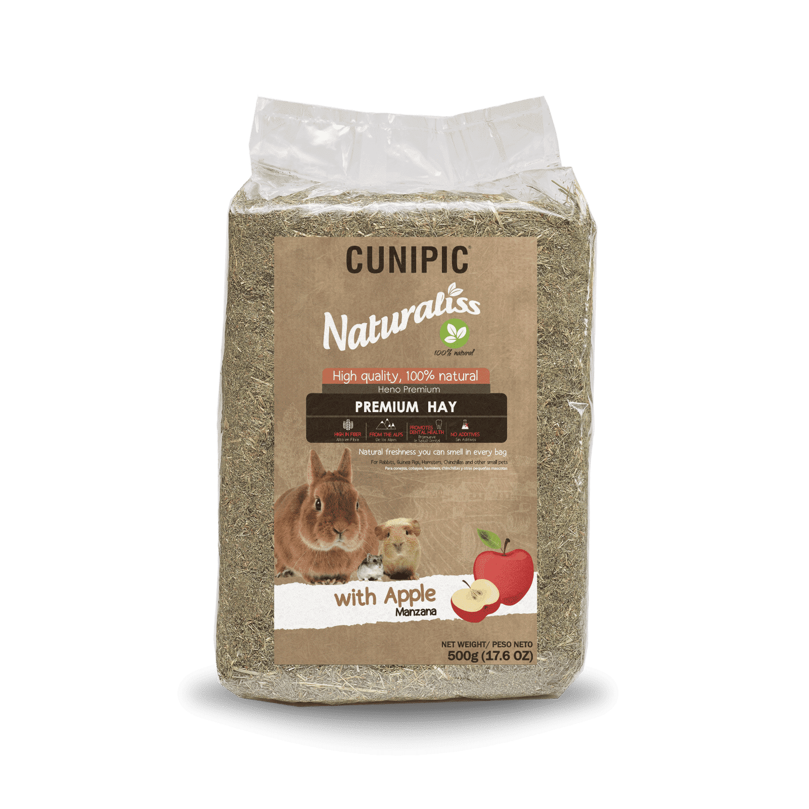 חציר פרימיום למכרסמים עם תפוח מבית קוניפיק – חציר טבעי ואיכותי שנקצר בשדות ירוקים ליד הרי הפירנאים, מועשר בחתיכות תפוח טעימות לתוספת מתיקות טבעית וריח מעורר תיאבון. תורם לעיכול תקין, לשחיקת שיניים טבעית ולבריאות כללית של ארנבים ושאר מכרסמים. מתאים להזנה יומיומית. משקל: 500 גרם.