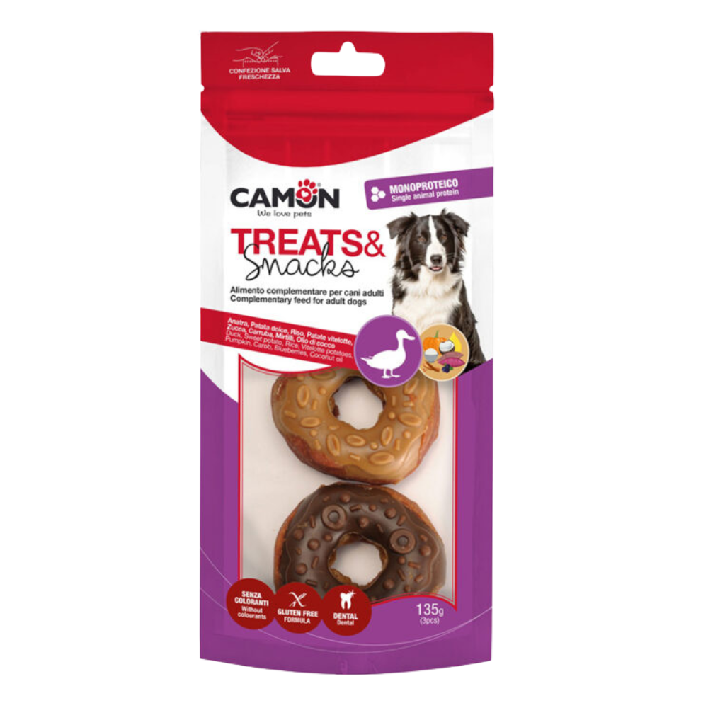 חטיפים טעימים במיוחד בצורת דונאט, המיועדים לעידוד לעיסה טבעית ותורמים לניקוי שיניים אצל כלבים בוגרים. מכילים חלבון ממקור חי אחד בלבד, ללא צבעי מאכל וללא גלוטן – מתאימים גם לכלבים עם רגישויות תזונתיות. החטיפים מגיעים במיקס טעמים עשיר הכולל ברווז, בטטה, אורז, תפוחי אדמה סגולים (ויטלוט), דלעת, חרוב, אוכמניות ושמן קוקוס. גודל כל יחידה: כ?7×3 ס"מ