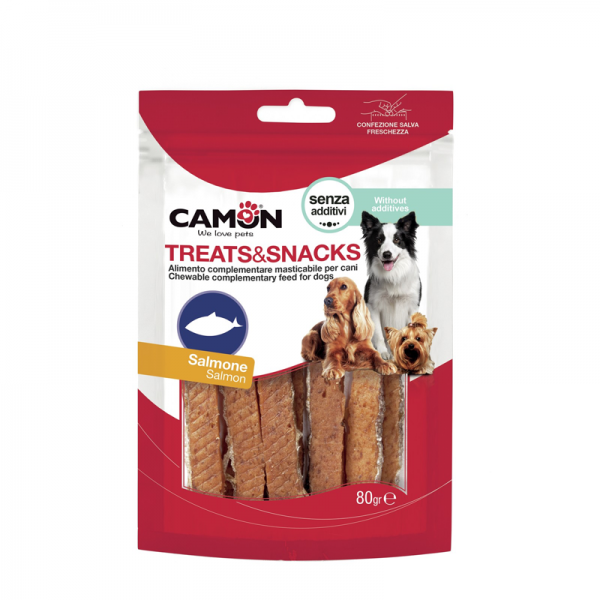 רצועות סלמון גדולות לכלבים – חטיף לעיסה מפנק על בסיס סלמון איכותי, מושלם כתגמול טעים ובריא. מתאים לכלבים בוגרים, עשיר בחלבון מן החי, ללא תוספים וללא גלוטן.