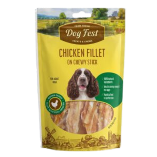 חטיף לעיסה לכלבים, המורכב ממקל לעיסה עשוי עור עטוף בפילה חזה עוף אמיתי. עשיר בחלבון (58%) ודל בשומן (2%), מתאים לכלבים בוגרים מכל הגזעים. נטול תוספים מלאכותיים, אידיאלי כפינוק יומי או כתגמול בזמן אילוף.