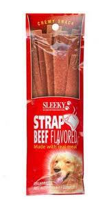 חטיף לכלב בצורת רצועות בטעם בקר. רכיבים: עוף, חיטה מלאה, סויה, חמאת חלב, סוכר, גליצרין, פוטסיום סורבה (כחומר משמר), מלח, חומרי טעם וריח.